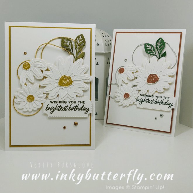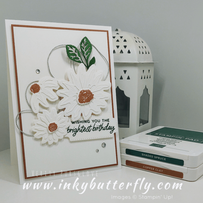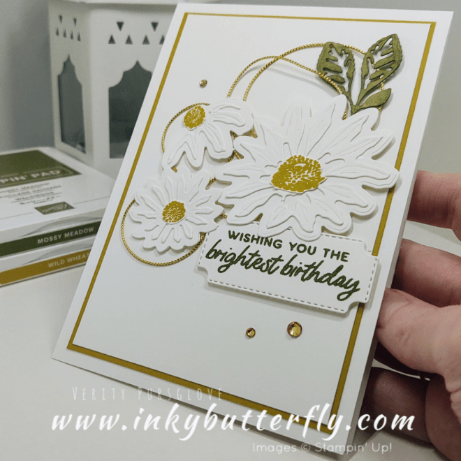 The layering and stamped flower centres used a new In Colour, Wild Wheat. Mossy Meadow was used to colour the leaves and stamp the sentiment.
