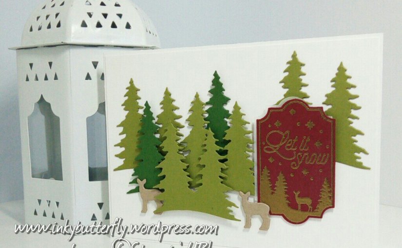 Trees were cut from Old Olive and Garden Green using the Card Front Builder dies. These were layered across the card front, some were adhered flat and others with dimensionals.