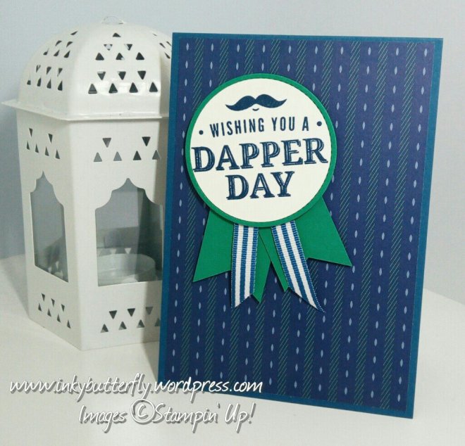 Emerald Envy card stock and Dapper Denim striped grosgrain ribbon was used to make the rosette tails.