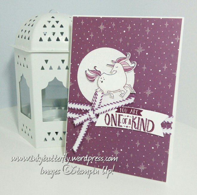 The magical unicorn was stamped with memento ink and coloured with Stampin’ Blends. She was adhered to the card with dimensionals.