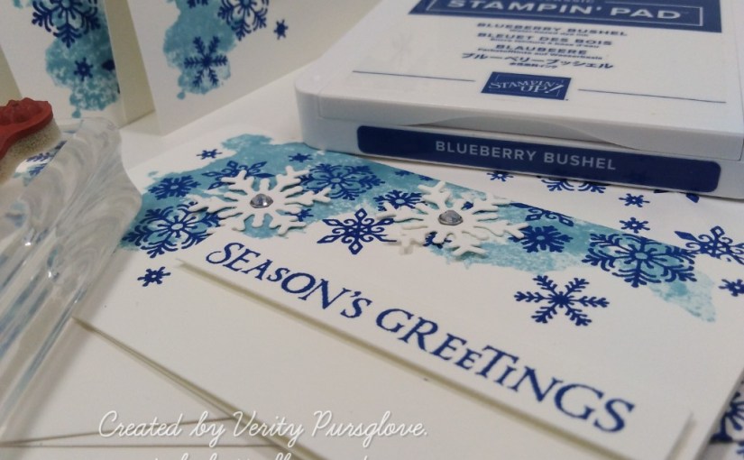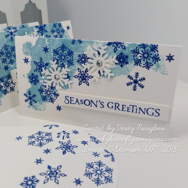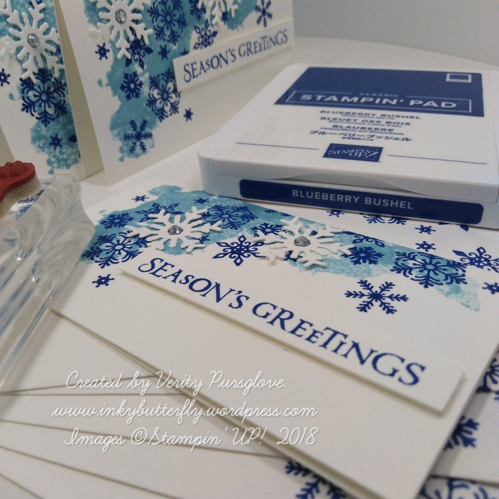 Blueberry Bushel ink was used to add snowflakes to the cards and envelopes. I also stamped the sentiment on to strips of white card stock.