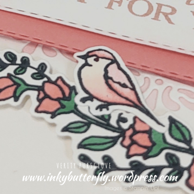 The florals and birds were coloured with Stampin’ Blends, Shaded Spruce and Flirty Flamingo!