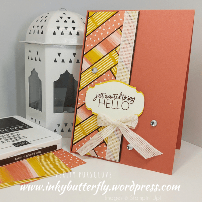 I tuned the layout on its side for a different look and used the Playing with Patterns Designer Series Paper. The Tailored Tag was dubbed with the retiring Story Label punch