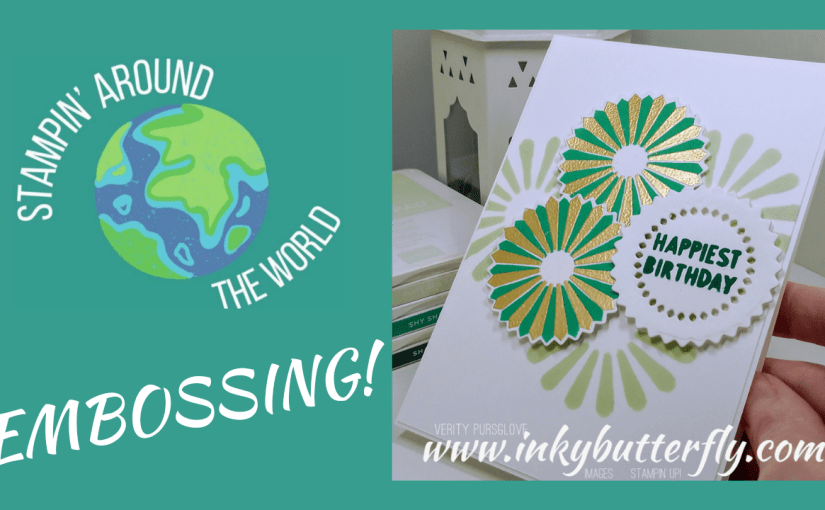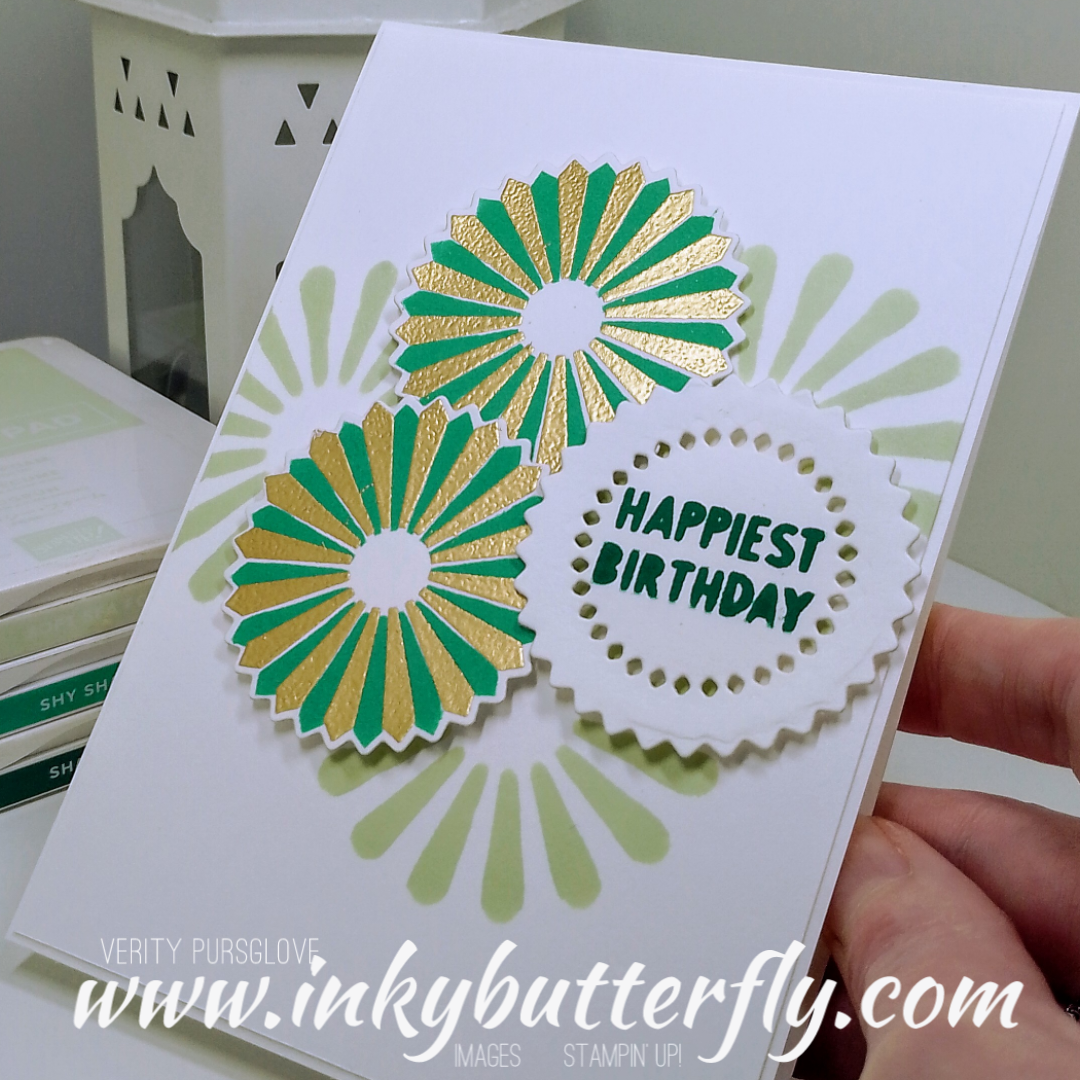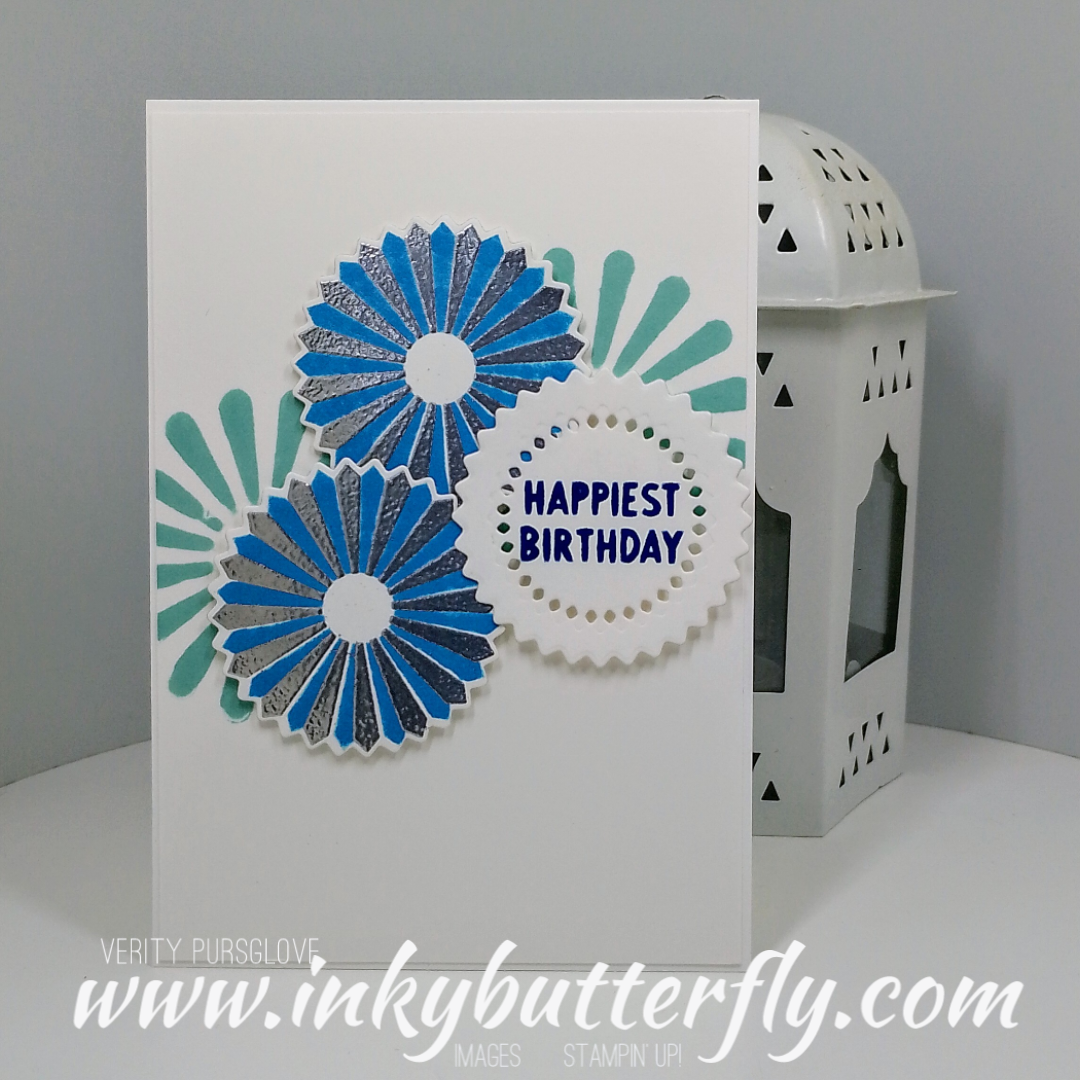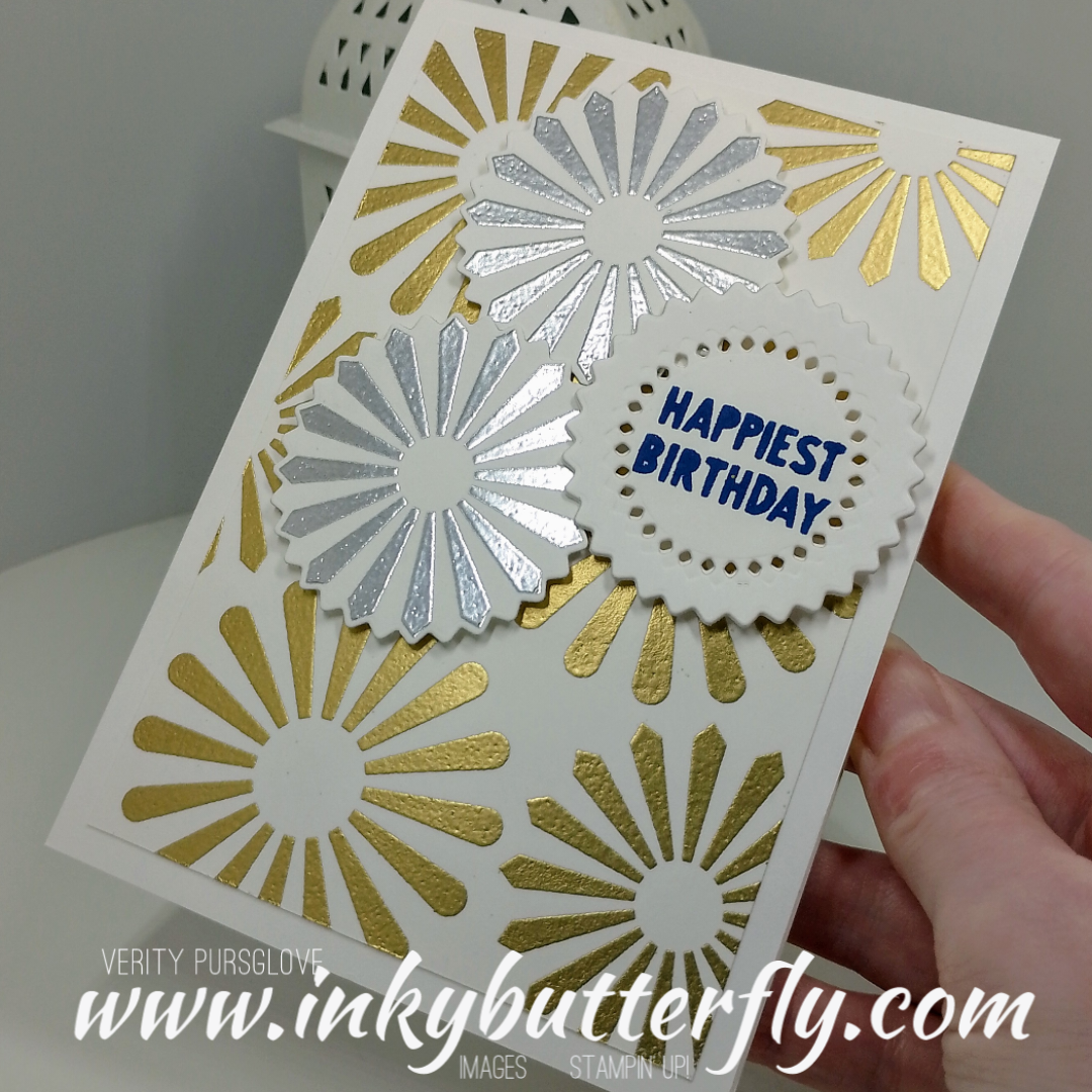 I have combined a monochromatic colour scheme with metallic embossing powders for a fum birthday card!