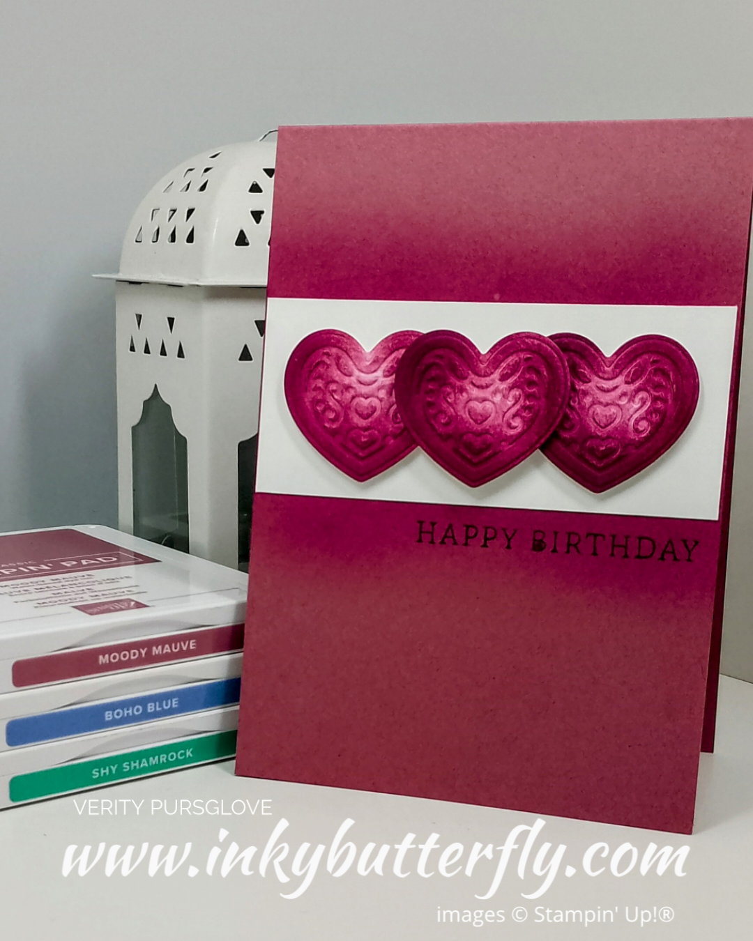 The embossing folder cuts nine hearts, e each of 3 designs. I added coordinating ink to enhance the detail and adhered the with dimensionals.