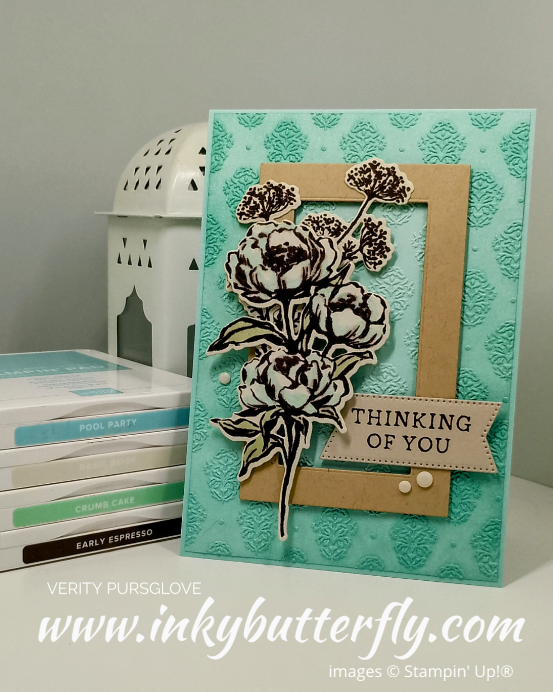 The blooms were stamped with Early Espresso ink on Basic Beige cardstock. Pool Party and Soft Sea Foam Stampin’ Blends added some subtle colour.