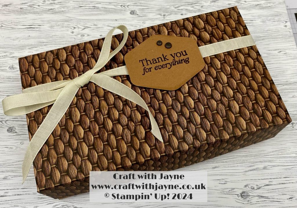 Jayne’s gift box could be for him or her with this woven look DSP, I love the beige ribbon closure ….