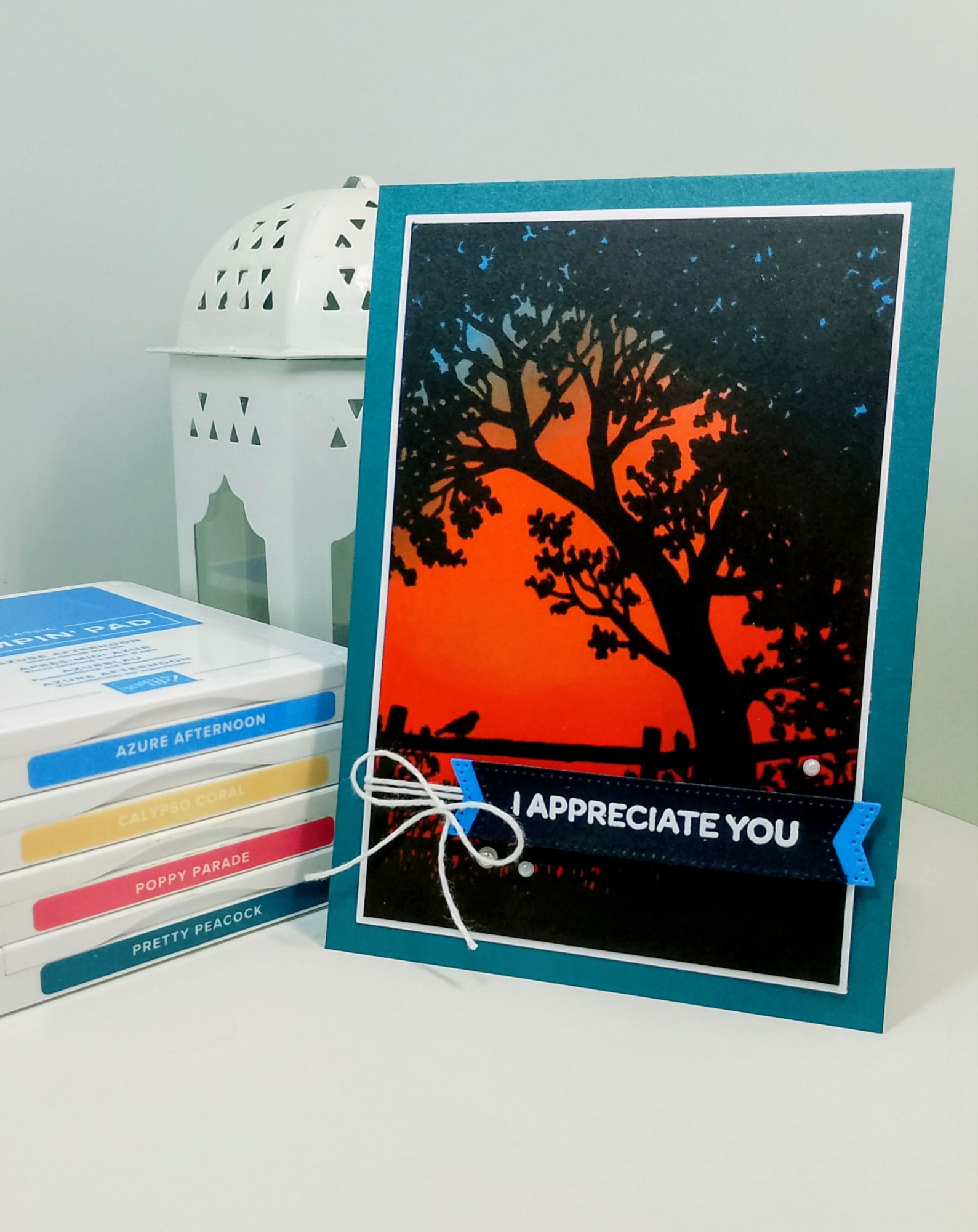 I used the Peaceful View stamp and used inks to create a blended “sunrise / sunset” look.