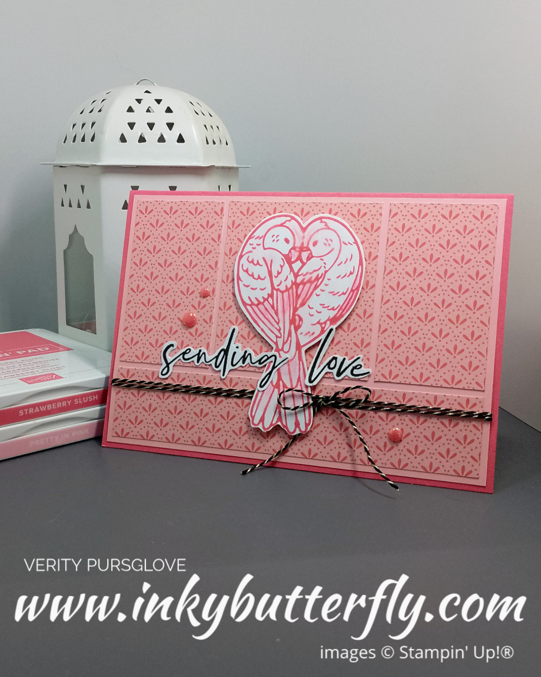 Pieces were added to Pretty in Pink two tone cardstock. I added some twine and adhered this to a Strawberry Slush card base.