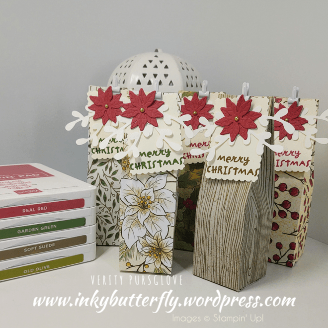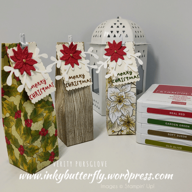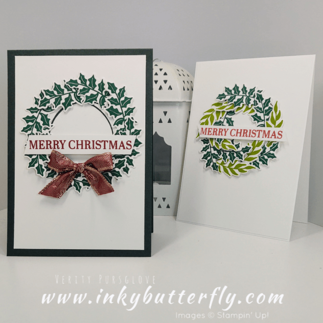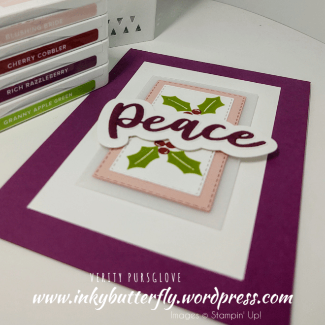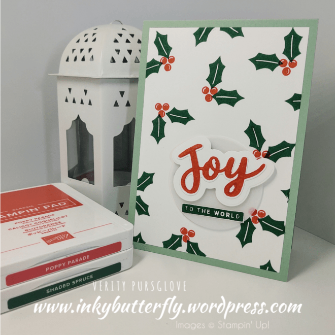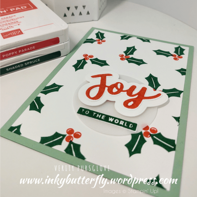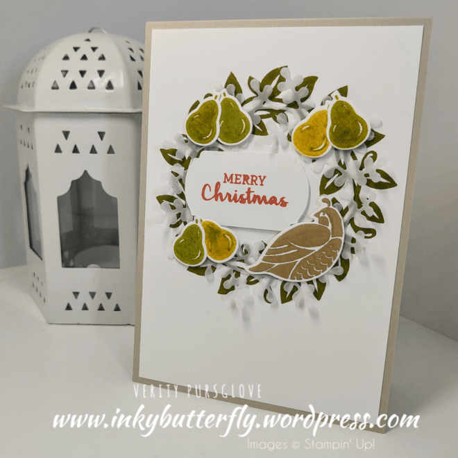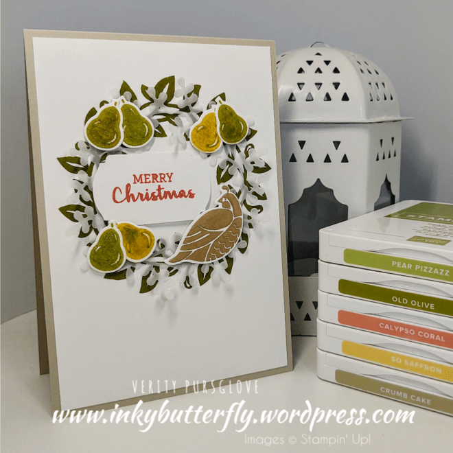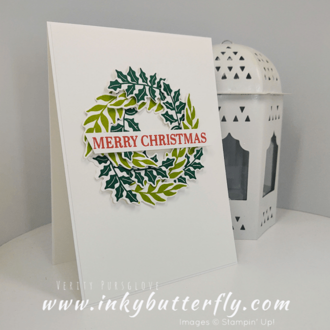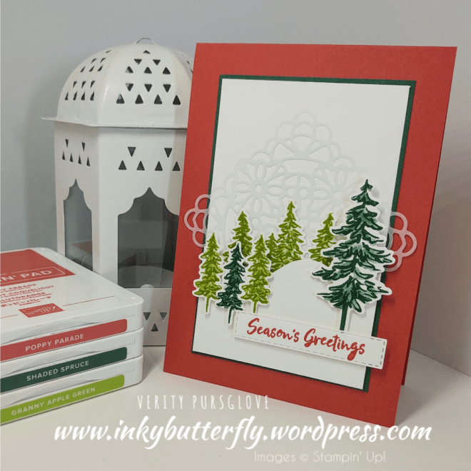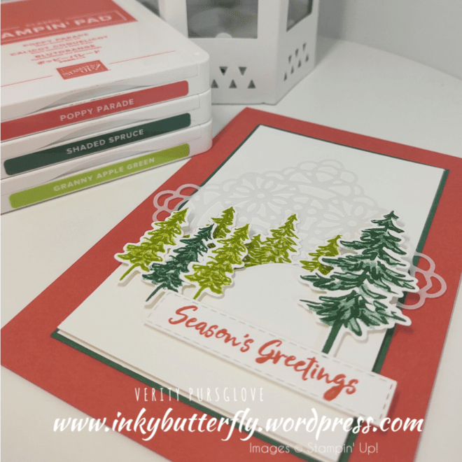 This sample uses more die cut, 12 in total, and uses a mixture of leaves in Shaded Spruce and Granny Apple Green. The sentiment is stamped with Poppy Parade.