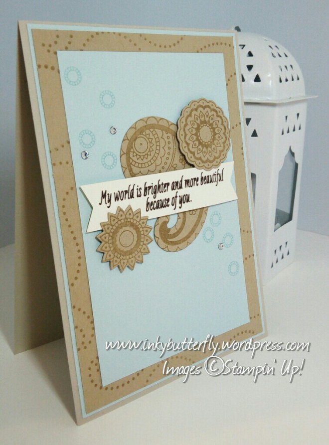 I started by constructing the cad base, first of all with Tempting Turquoise and adding Peekaboo Peach and Wild Wasabi. Finally, a white layer was stamped with the sprinkles image with Tempting Turquoise ink.