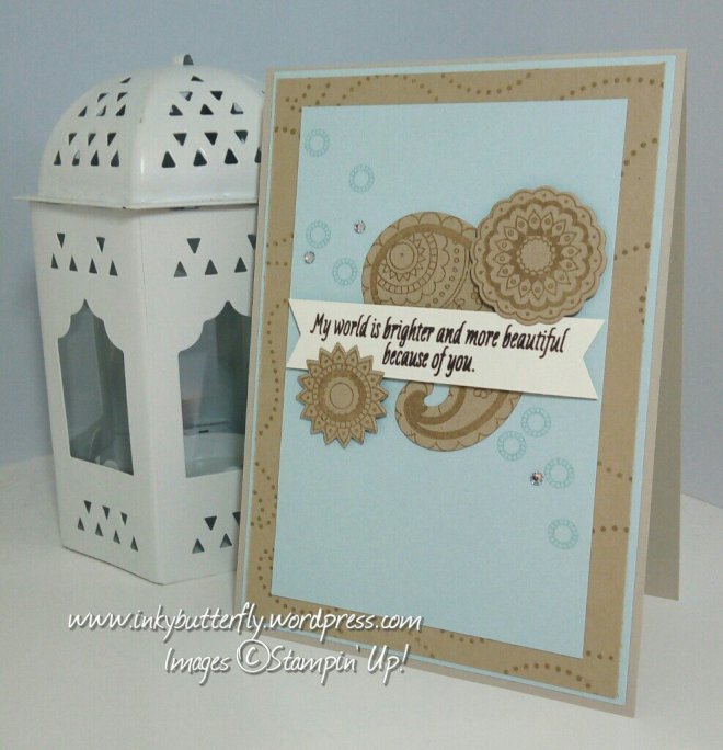 The central topper was made by adding a 3 inch square of Whisper White to Wild Wasabi and Peekaboo Peach layers.
