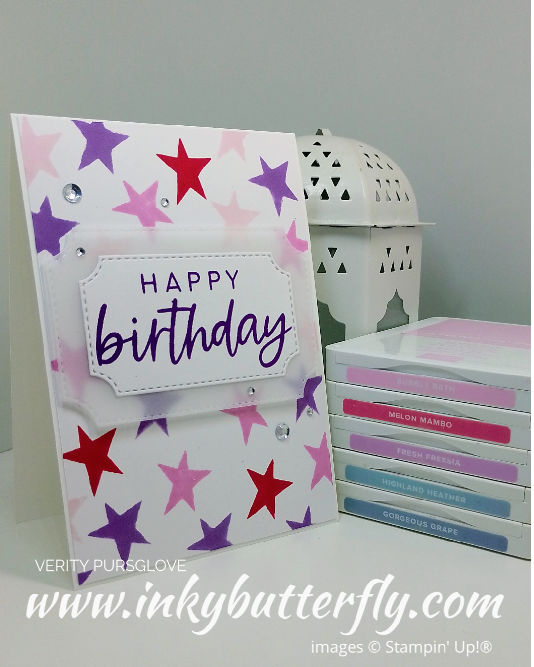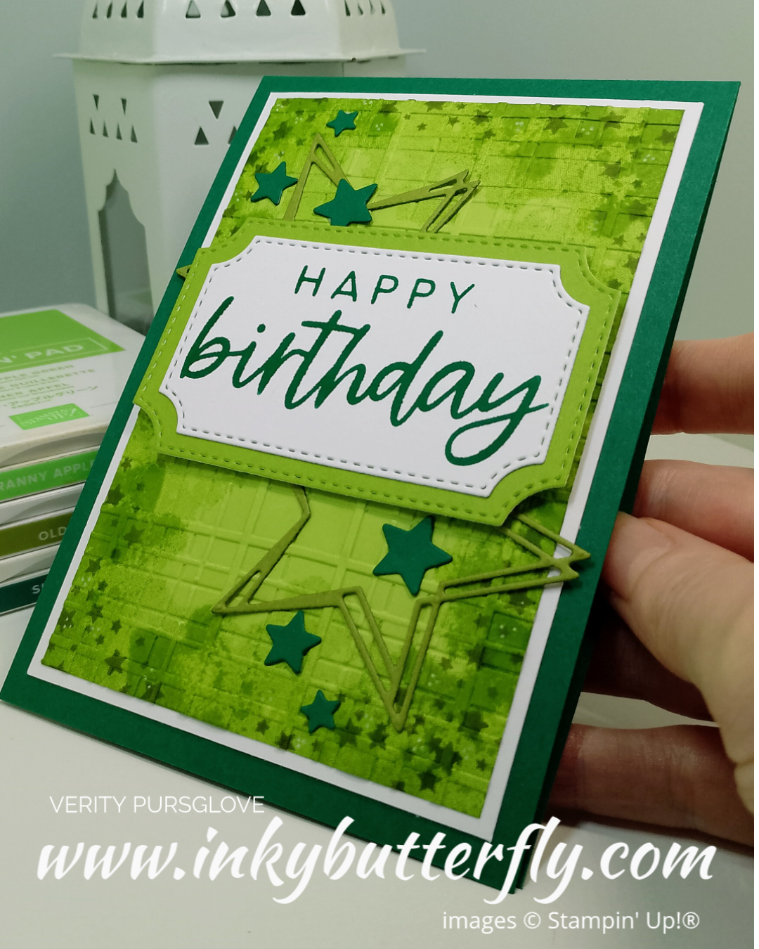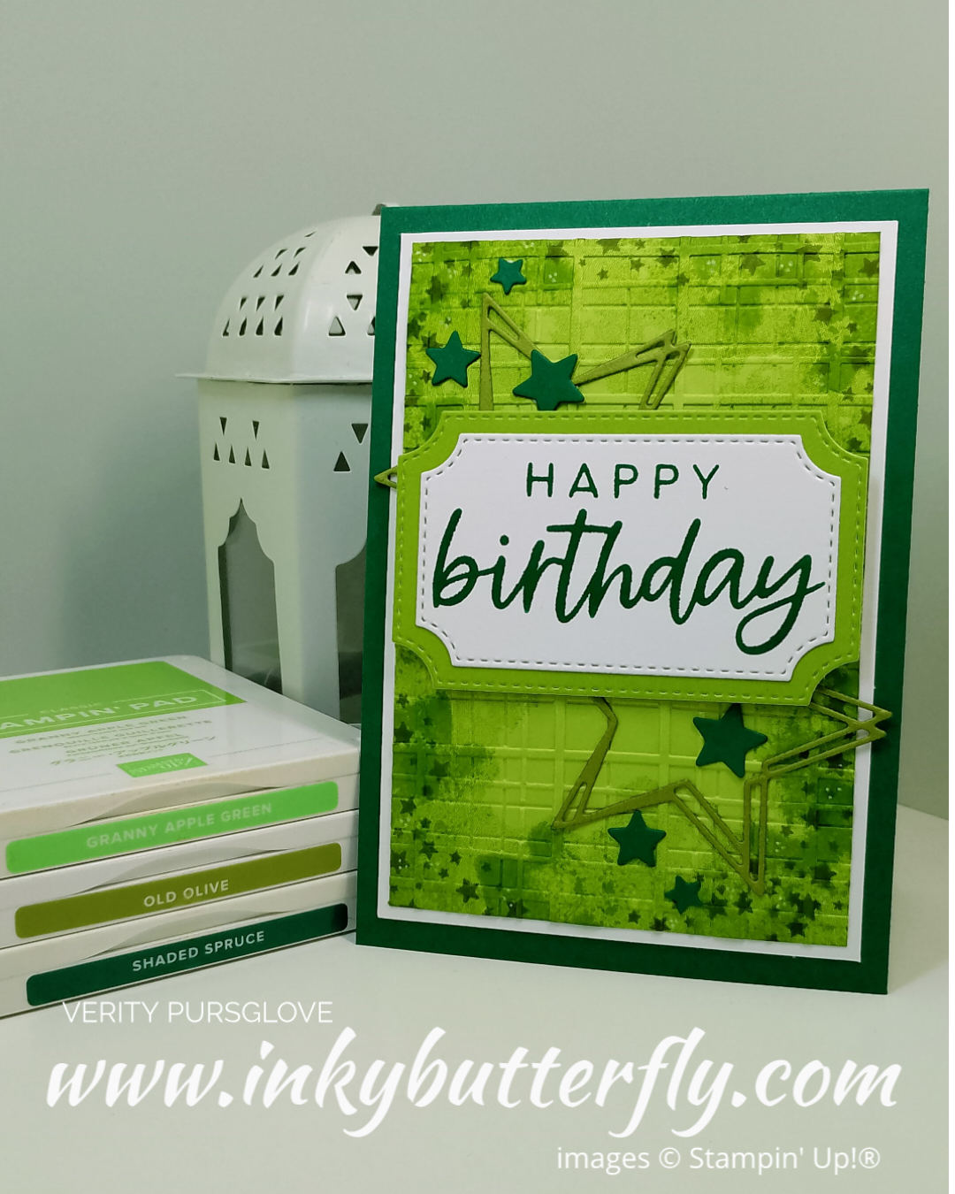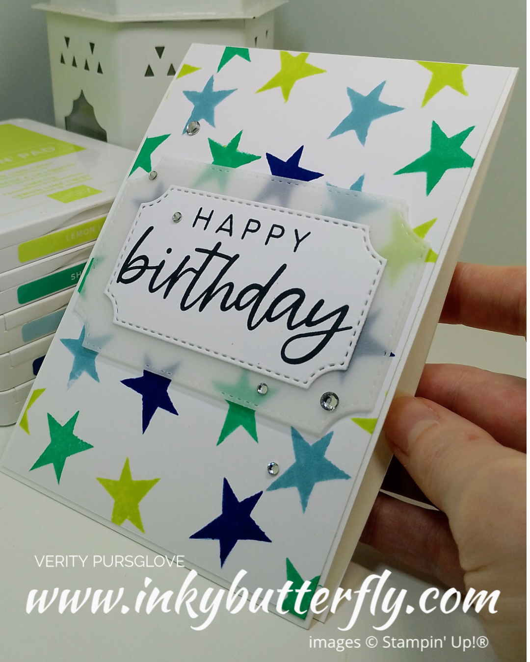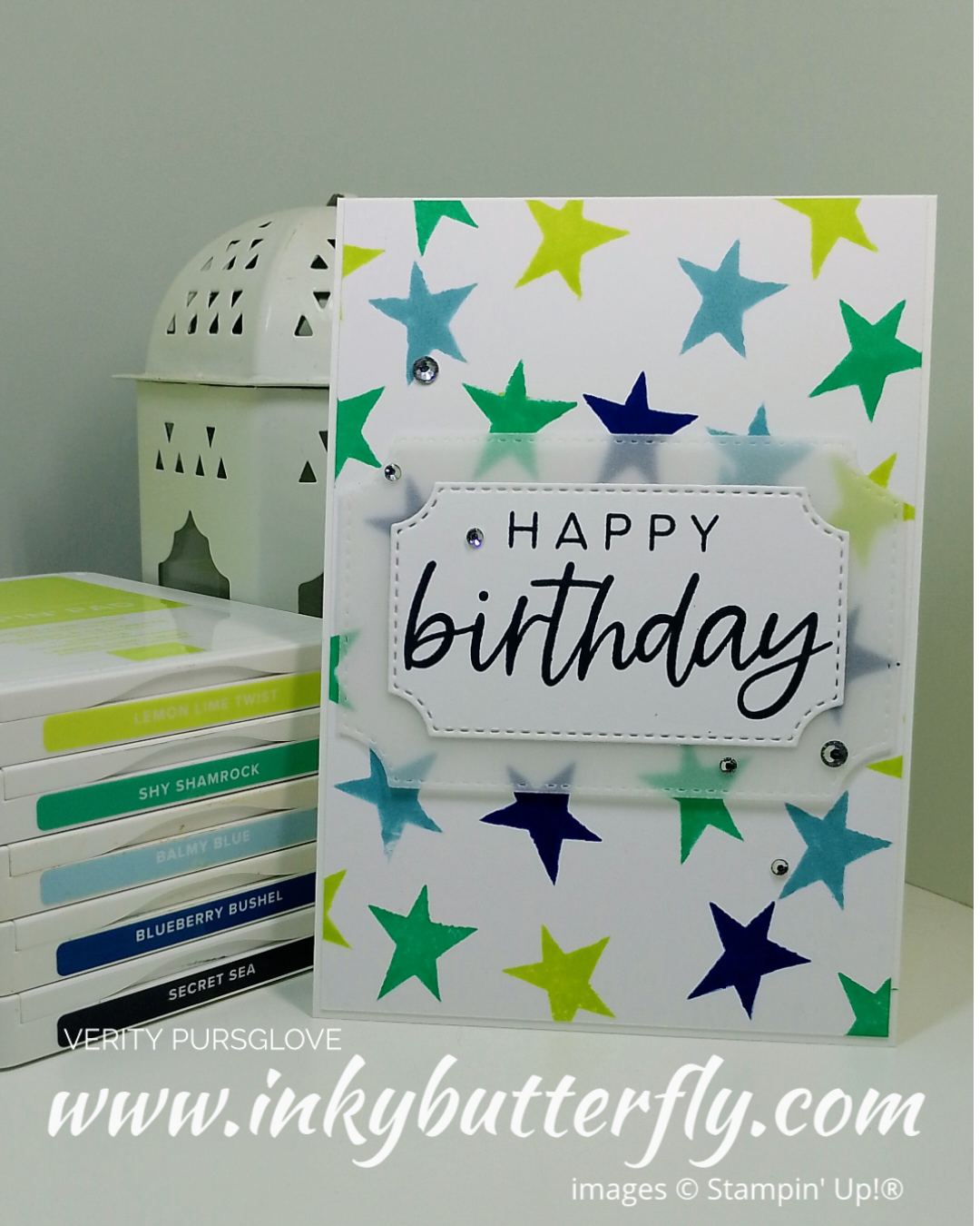 A combination of Blueberry Bushel, Balmy Blue, Shy Shamrock and Lemon Lime Twist inks were used to stamp the stars.
