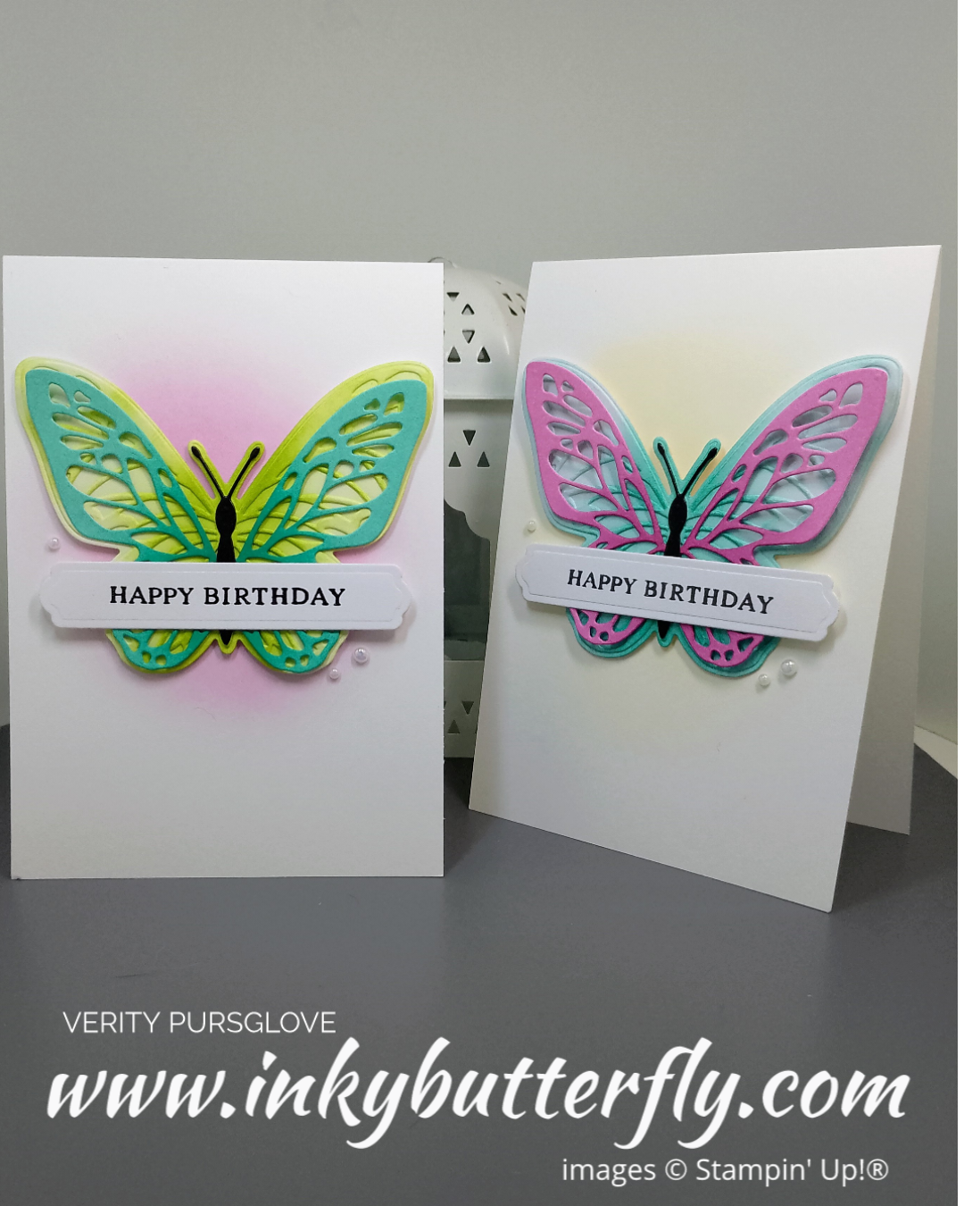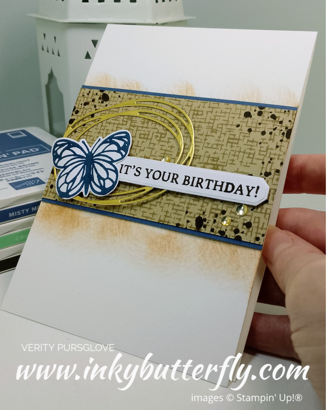 The hybrid embossing folder was used to create the base butterfly. Summer Splash ink was added over the top with a blending brush.