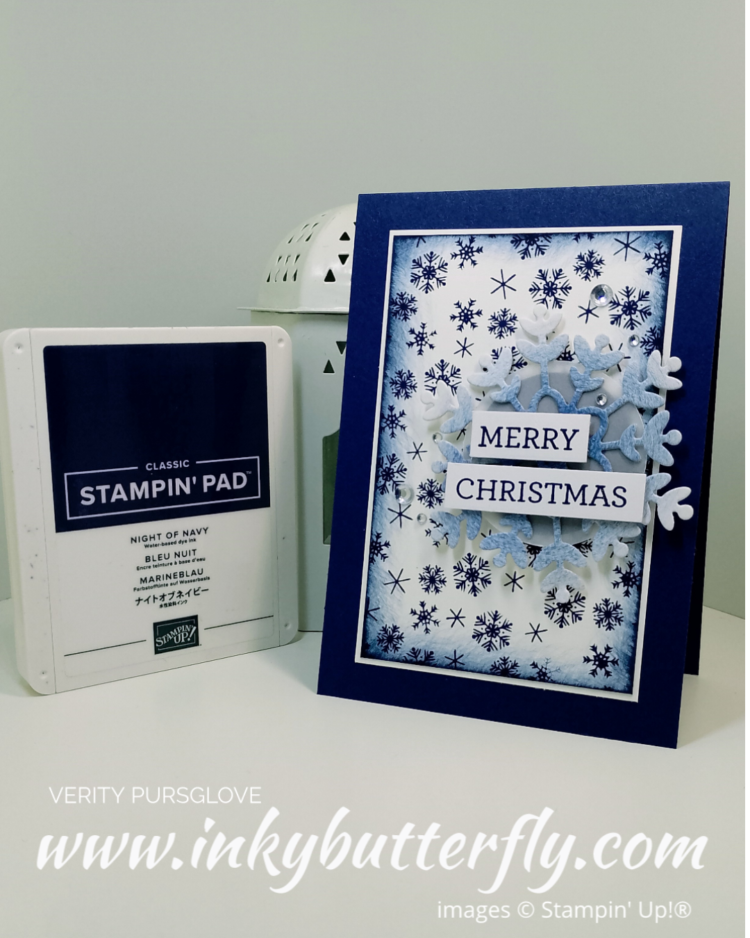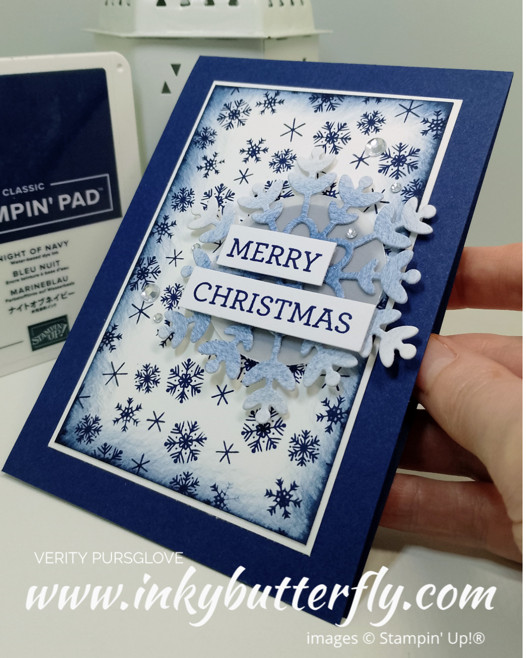 The background was stamped with the small snowflake stamp, with ink added around the edge with a blending brush.