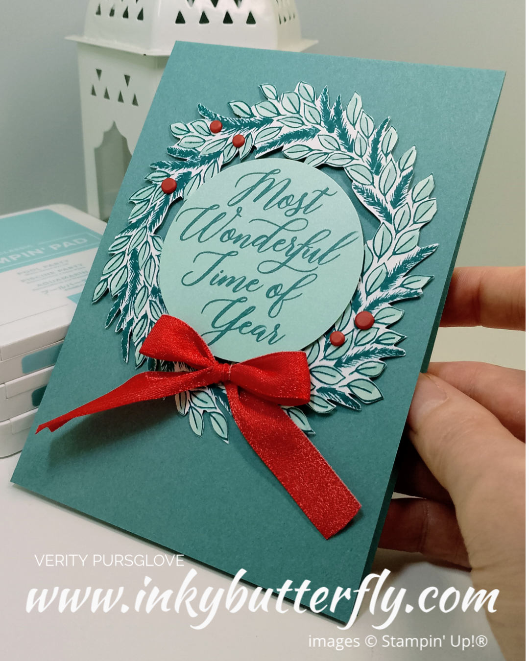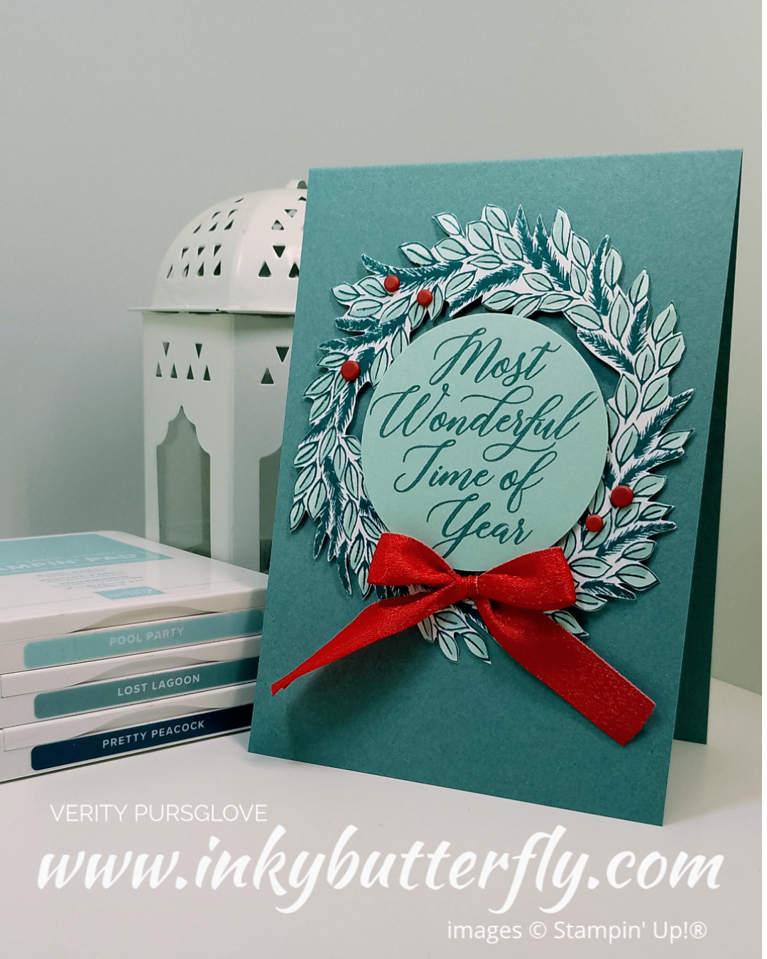 Pretty Peacock ink was used to stamp the wreath on Basic White cardstock. Leaves were coloured with Lost Lagoon and Pool Party Stampin’ Blends.