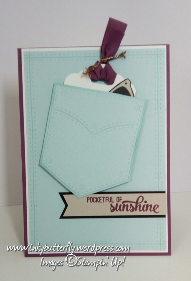 Stamp and fussy cut the pocket. Add adhesive foam strip along the sides and bottom. Adhere to the card at an angle allowing room for the tag.