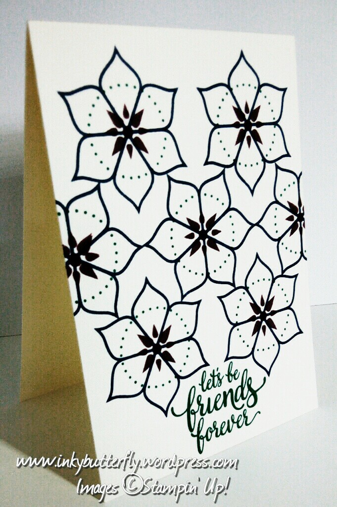 I stamped the flowers first, using light and dark shades of each colour; these are listed in the supplies. Then I added the stems and leaves.