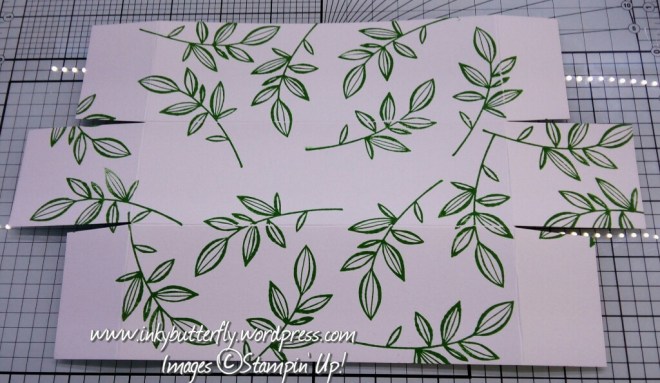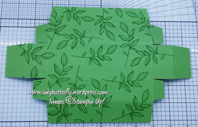 For the lid, cut some Cucumber Crush card to 11 1/2 by 7 inches. Stamp the leaf as before. Score at 1 1/4 and 2 1/2. The lid will be reinforced for added strength: