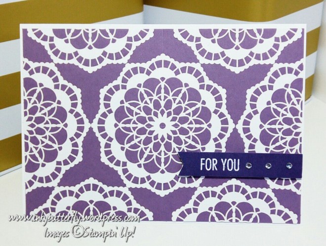 Here, I have used Perfect Plum and white doilies arranged slightly differently. The sentiment was added with Elegant Eggplant card, also heat embossed.