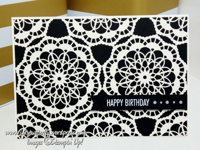 The idea of making a background had been in my mind for a while.  The first card is made with black card and the vanilla side of the doily.
