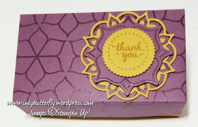 The lid is made using Tranquil Tide card stock from the Eastern Palace bundle. Cut to 5 1/4 by 7 3/8.