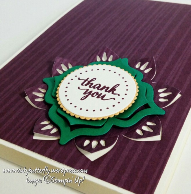 I started by using a die from Eastern Medallions to cut in to a piece of Fresh Fig designer paper. This was adhered to a Very Vanilla card base.
