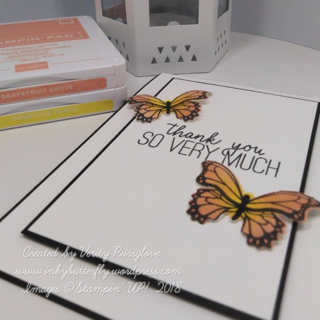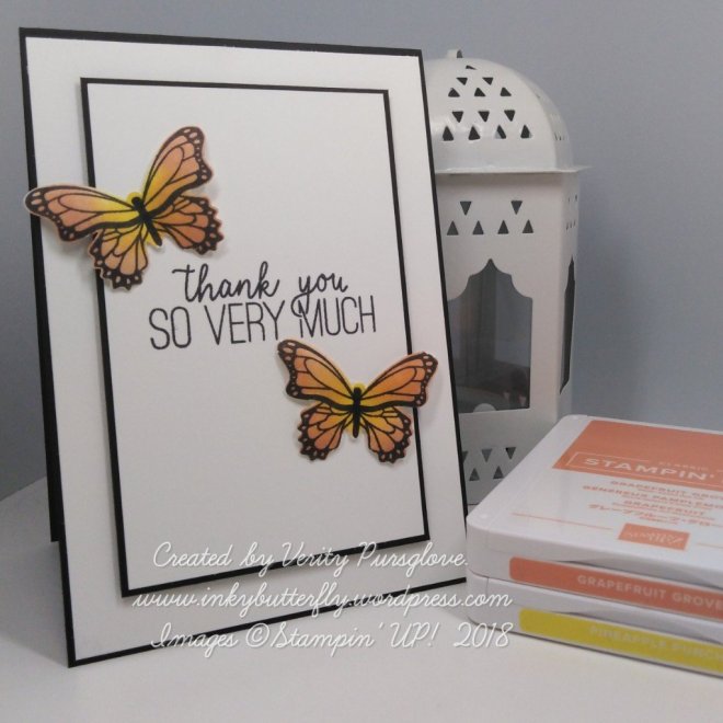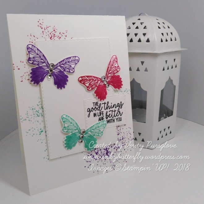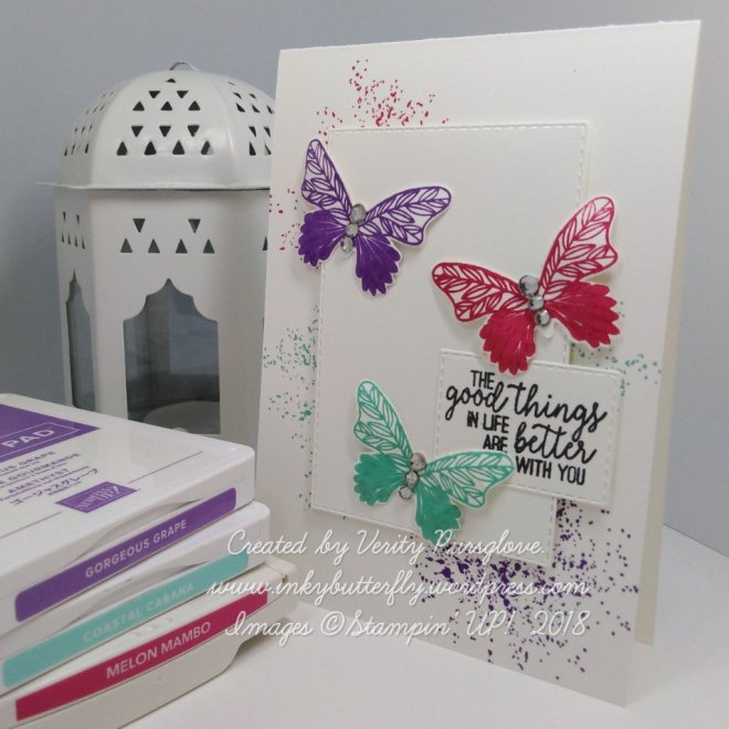 Gez is using a colour challenge to inspire her card design… And there are more butterflies… Lifting the wings on the punched shapes brings them to life…