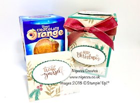 The Pretty Label Punch was used to cut some Cherry Cobbler card stock. To this I adhered three pine sprigs die cut from Granny Apple Green card stock.