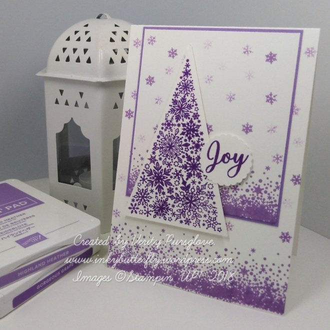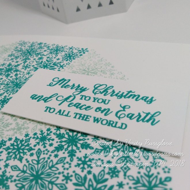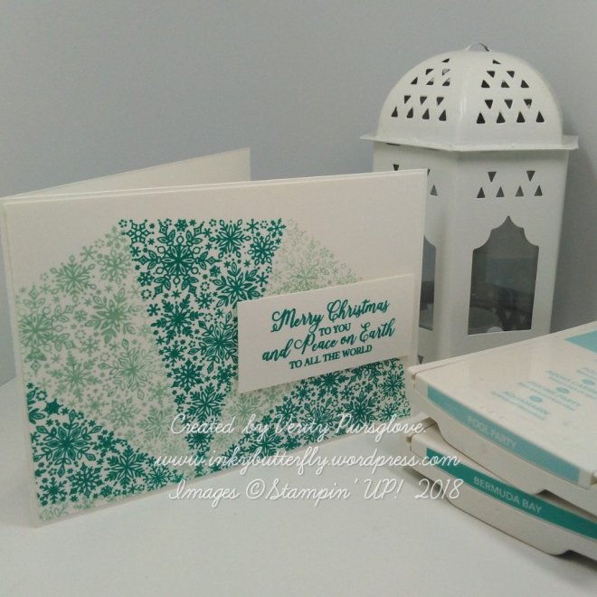 I cut strips of All is Bright designer series paper and adhered these to a white card base.