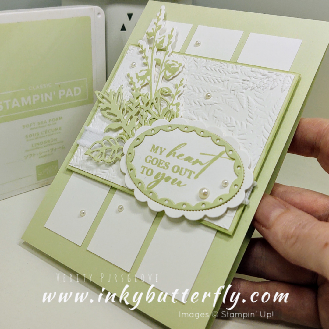 The embossing folder cuts nine hearts, e each of 3 designs. I added coordinating ink to enhance the detail and adhered the with dimensionals.