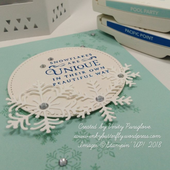 A die cut snowflake was adhered with Multipurpose glue and rhinestone added to the centre.