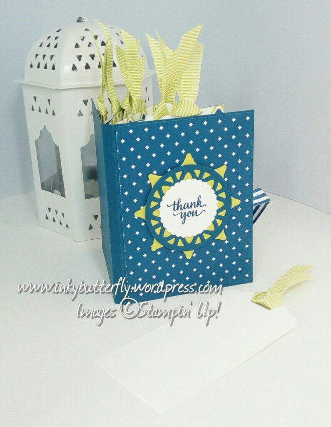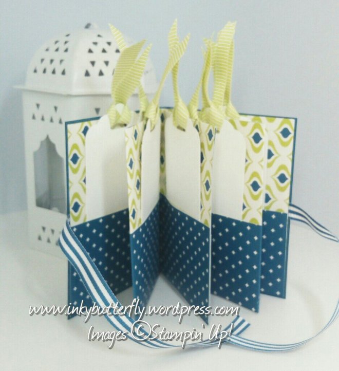 The tags were made by cutting 2 inch strips of card stock with the Tag Topper punch. These were threaded with Lemon Lime Twist mini striped ribbon.