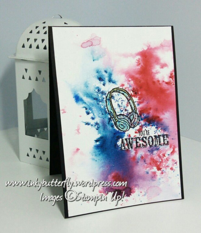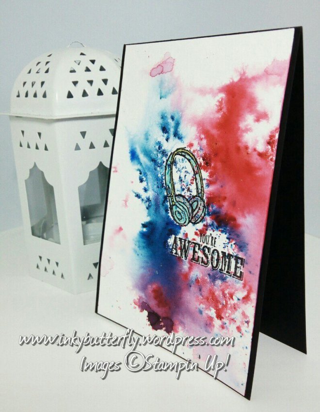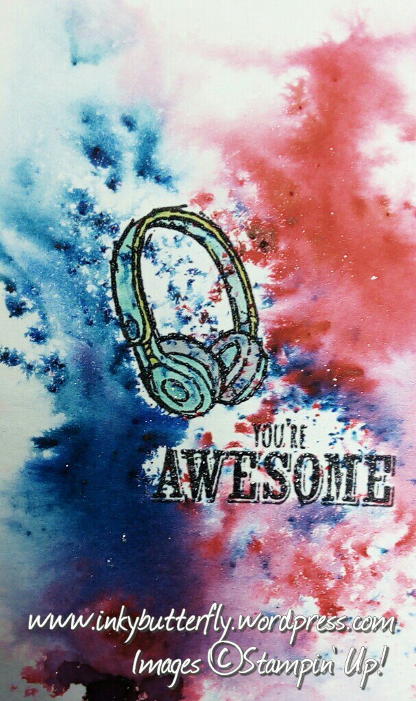 Using Epic Celebrations, I stamped the guitar and the word “awesome” with Dapper Denim ink.