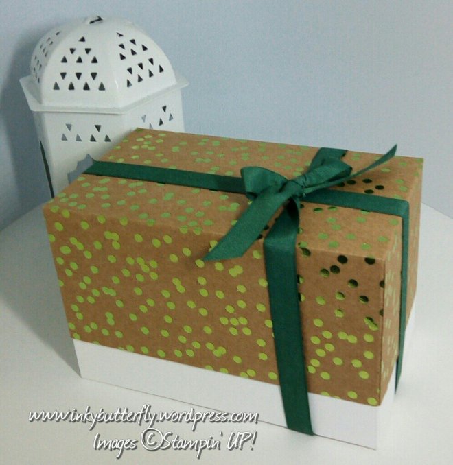 To make the topper, I cut a 2-1/2 inch strip of Lemon Lime Twist Foil Frenzy designer series paper. To this I adhered a 2 inch piece of Crumb Cake.