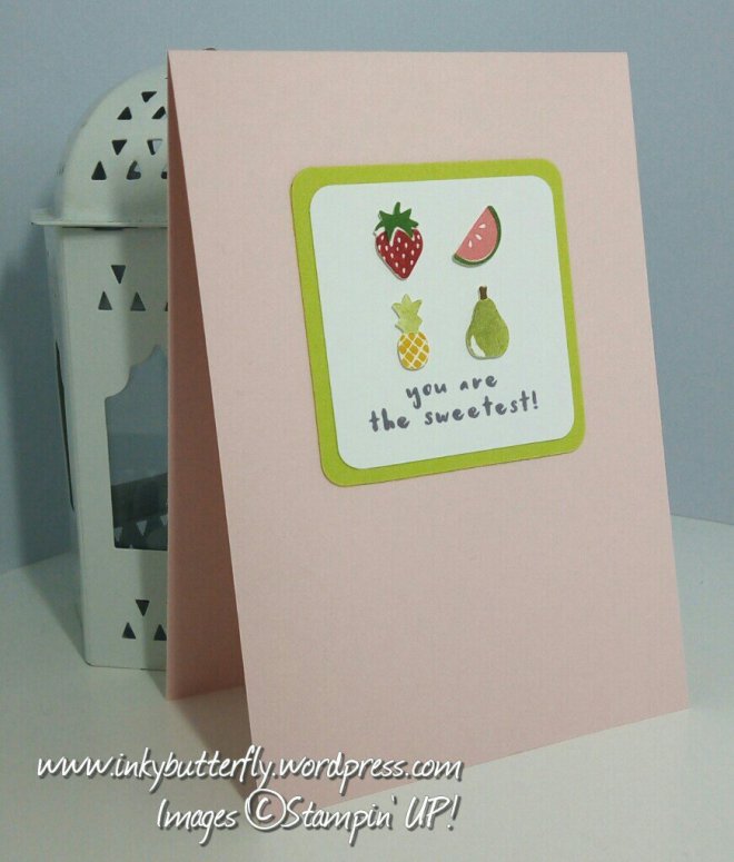 The sentiment was stamped with Wild Wasabi ink. A tiny heart from the Fruit Basket set was used to embellish the background.