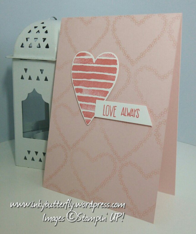 On some watercolour paper, I stamped the striped heart from the Heart Happiness stamp set using clear Versamark ink. This was heat embossed with clear powder.