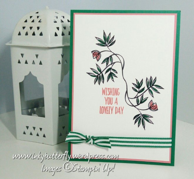 The sentiment was stamped with Emerald Envy ink and positioned at the top of the card the balance the embellishments.