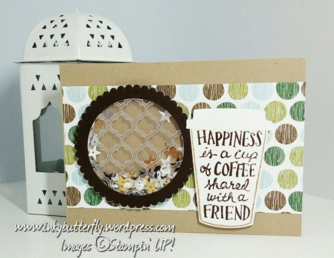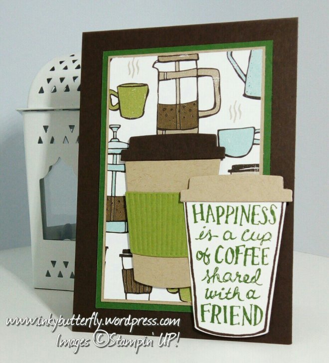 A coffee cup was die cut from Whisper White and Crumb Cake card stock. Cup lids, from Early Espresso and Whisper White and a cup sleeve from Old Olive.