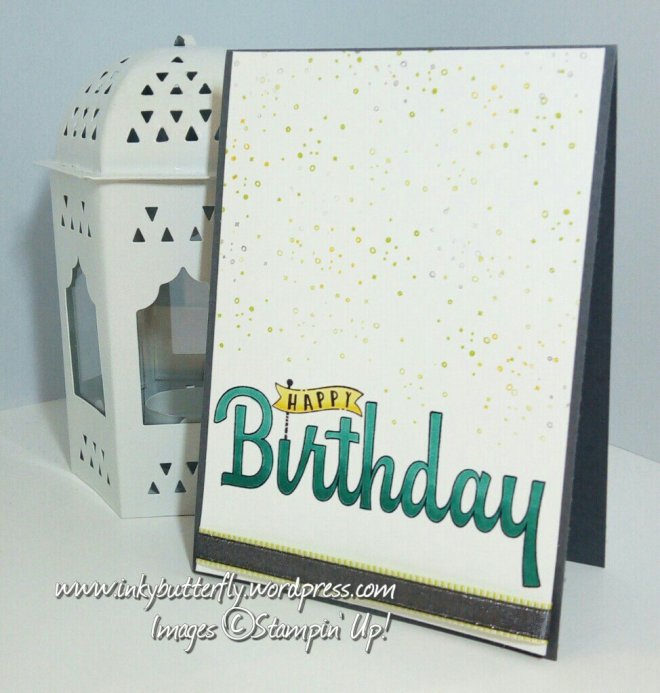 White Polka Dot Tulle ribbon and Rose metallic thread were looped and secured on to the card. The sentiment was added over the top with dimensionals.