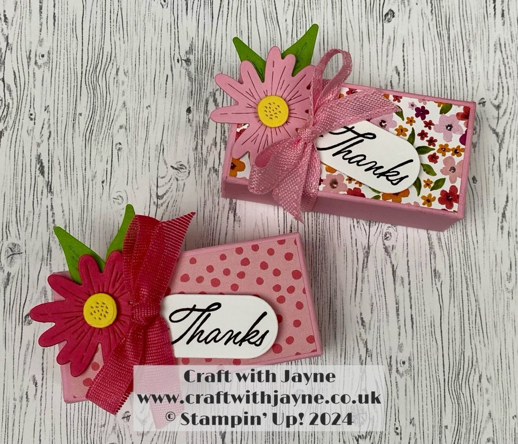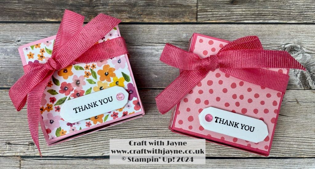 Jayne has made these adorable tiny gift boxes decorated with cute DSP and matching faux linen ribbon ….