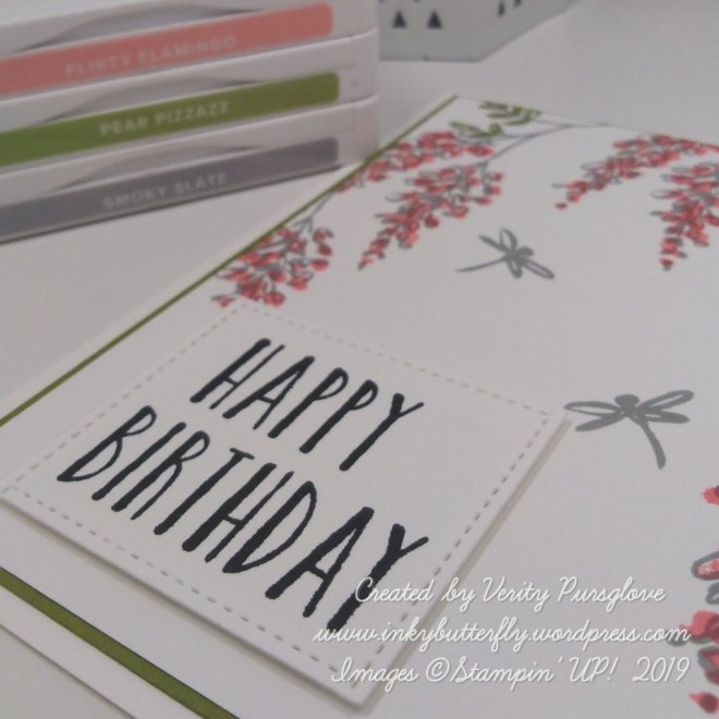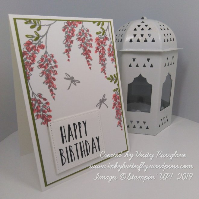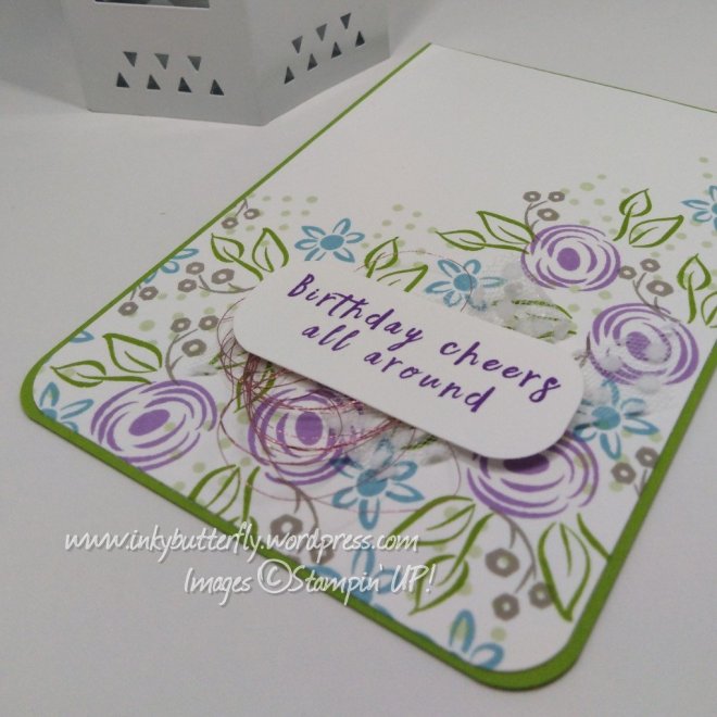 My card also features retiring products, Perennial Birthday stamp set, the Pretty Label Punch and Call Me Clover ink.