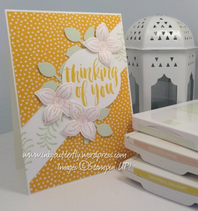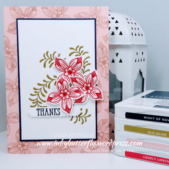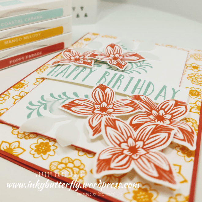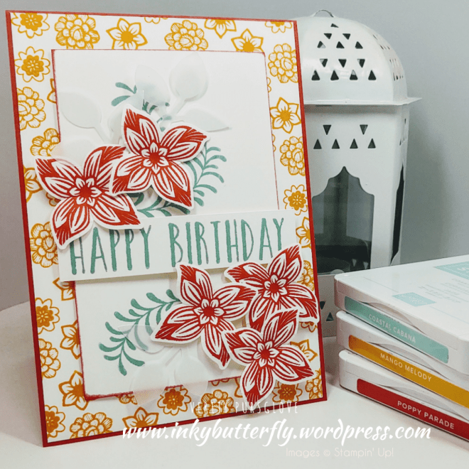 I stamped my own background layer with Pop of Petals and Mango Melody ink. This adhered to a Poppy Parade card base.