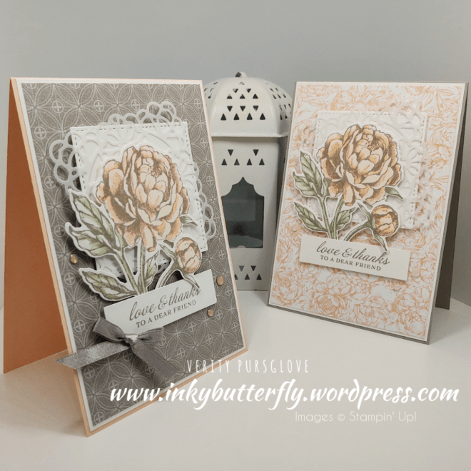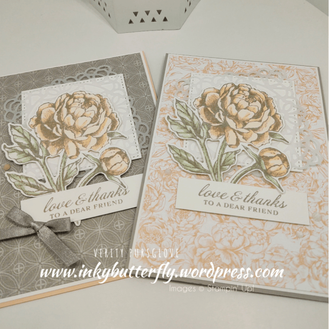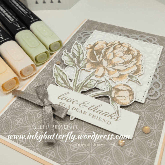 Gray Granite ink was used to stamp the peony image which was coloured with Soft Sea Foam and Petal Pink Stampin’ Blends and die cut.