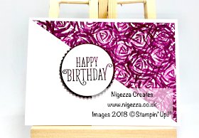 Some Very Vanilla card stock was cut to size. Stampin’ Sponges were used to colour the card stock starting in the centre. This card uses Gorgeous Grape and Melon Mambo inks.