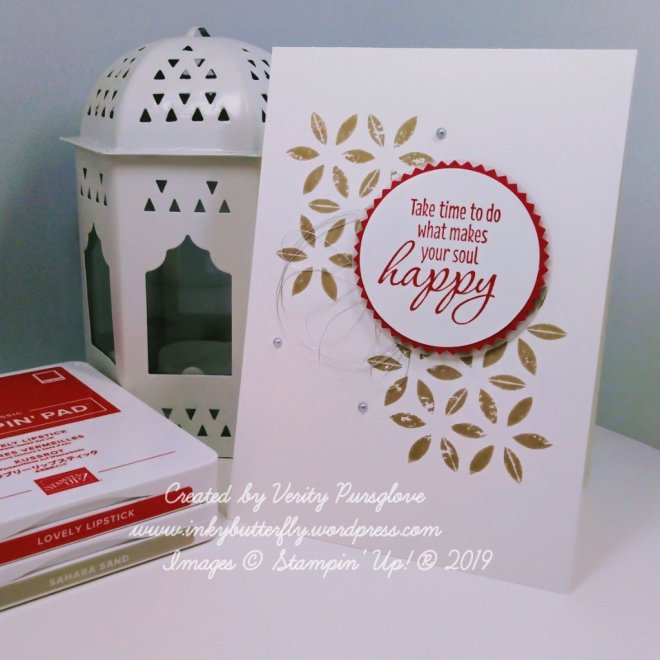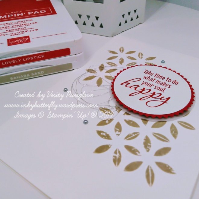 The centre colour was used to stamp the sentiment which was cut with the 2″ circle punch. This was adhered to a Starburst punched from the combo colour.