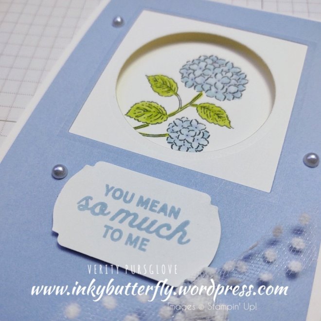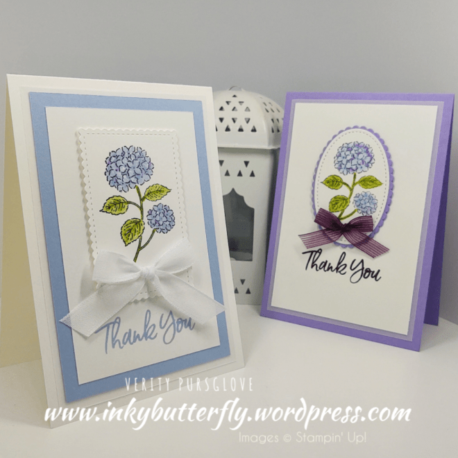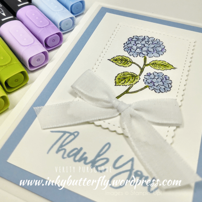 The hydrangea was coloured using Stampin’ Blends markers. The acetate can be used colour side up or down, stretching it’s use to other projects!