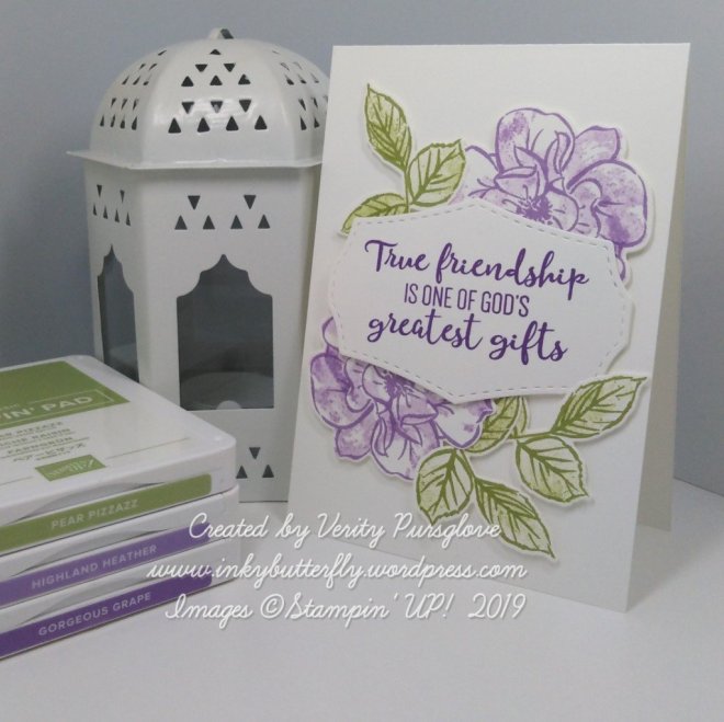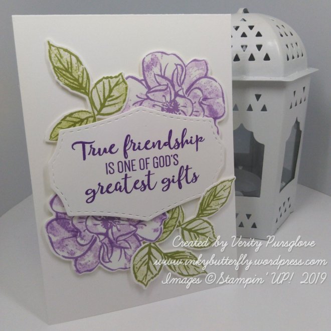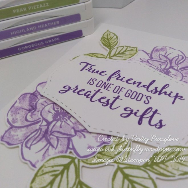 Mango Melody ink was used to stamp the floral from the To a Wild Rose stamp set. The centre portion was stamped again and layered onto the first.
