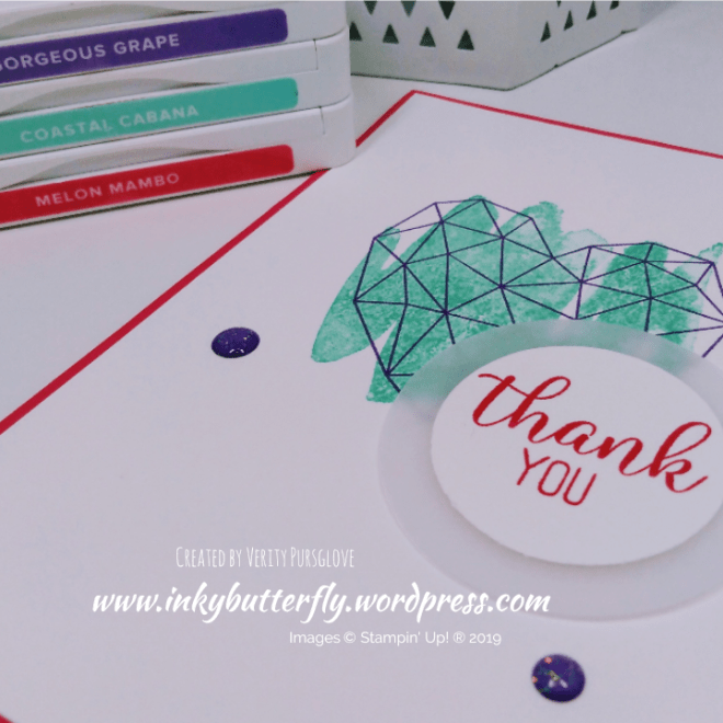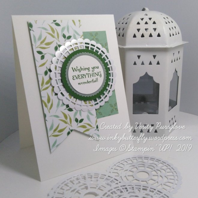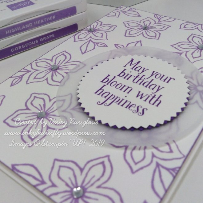 The sentiment was cut with a 1-1/2 inch circle punch and adhered to a 2-1/4 inch circle of vellum. This was added to the card with dimensionals.