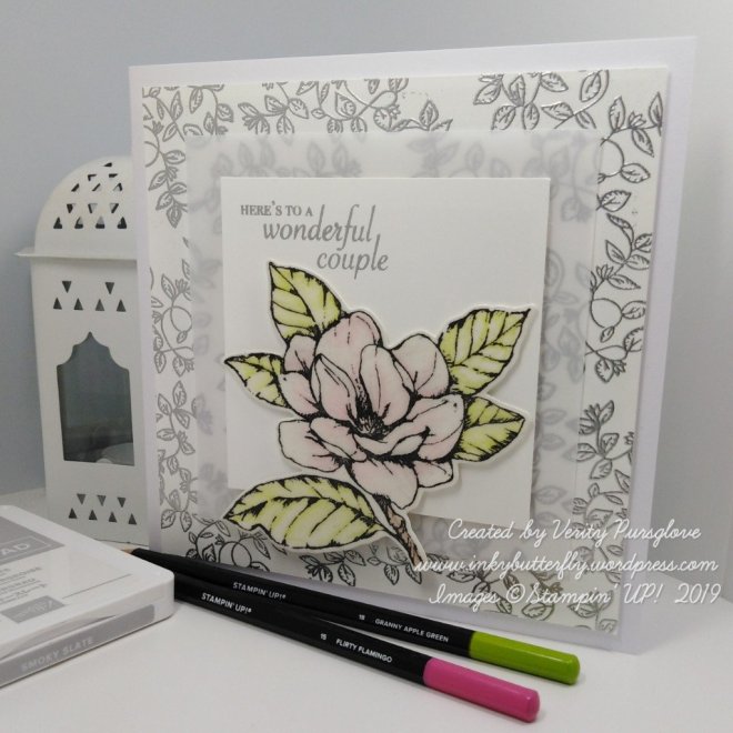 This is the Garden Green version. On this card I moved the sentiment to the side and added some metallic pearls.